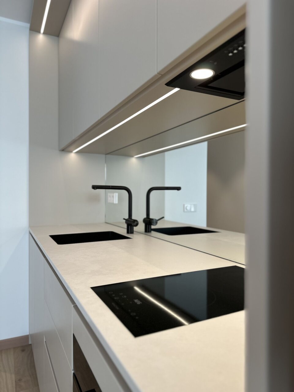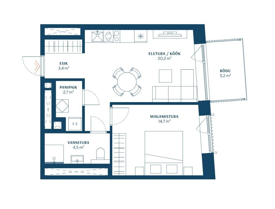 Kvaliteetne mööbel ja uus kasutamata köögitehnika täidab nii väiksemad soovid kui ka asjatundjast toiduvalmistaja nõudmised suurepäraselt. Piisavalt leiab kappe-riiuleid. Kogu tehnika on premium tootjatelt (Elektrolux, AEG, Bosch): nõudepesumasin, ahi, induktsioonpliit, täismõõdus külmik. Laud ja toolid neljale einestajale.