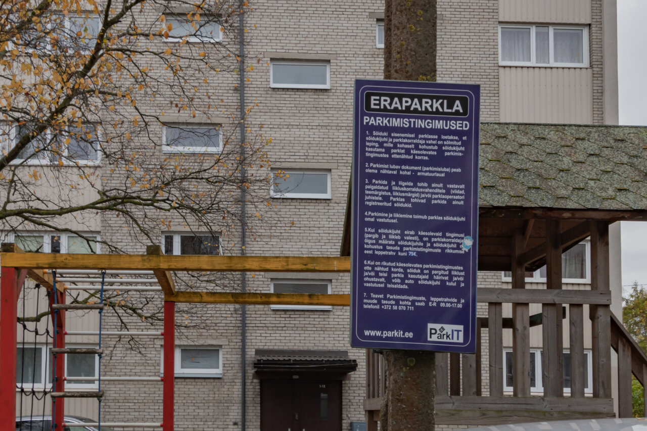Maja ees on lapseplats ja asfalteeritud parkla.